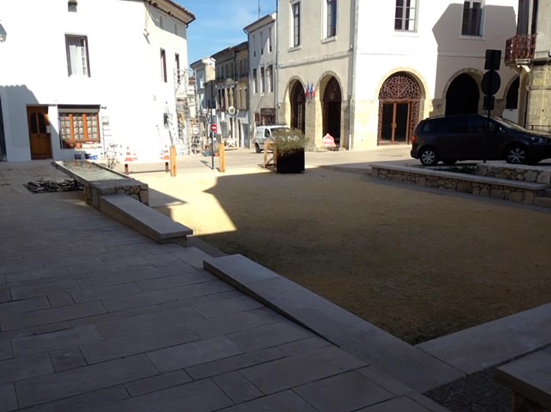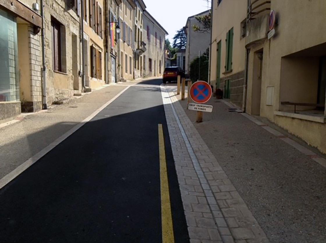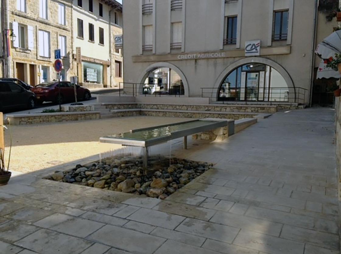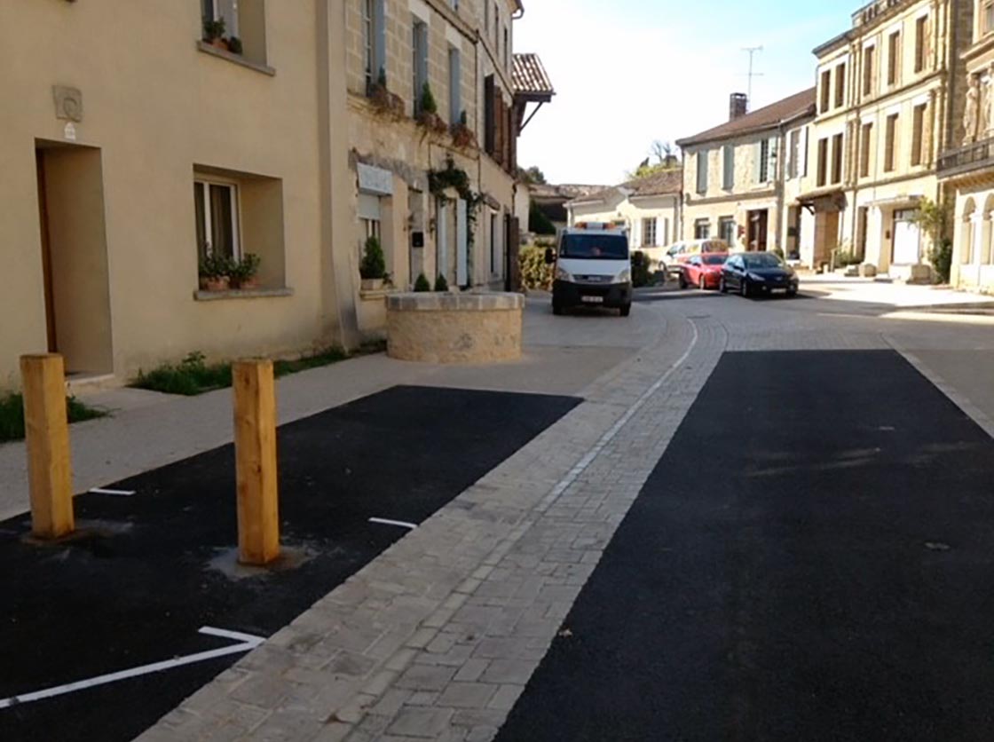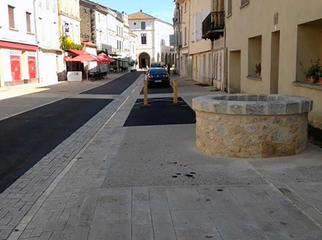 Nous avons créé une place, des gradins en pierre et moellons naturels, un puit en pierre, posé un banc en pierre naturelle et crée une main courante tout en mettant en place la signalisation verticale et horizontale.